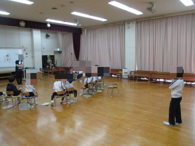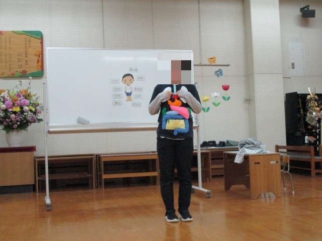体の名称や働きを知ることで自分の体に興味や関心をもってほしいと思い年長児に「体」についての保健指導を行いました。頭や肩、腕など自分の体に触れたり動かしたりし、体の中はフェルトで作った内臓をTシャツに貼りつけた教材を使って知らせました。心臓は握りこぶしくらいの大きさであることや小腸は大人で6~7mあることを知らせ、実際の長さをひもを使って知らせると「まだ伸びるの?」「すごく長いね!」と興味や関心を持っている姿が見られました。