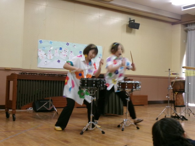 本園の学校協議会会長様のお声かけにより、マリンバコンサートを遊戯室で行いました。 プロのマリンバ奏者(ハッピーパーカッション)の方が来られて、子どもたち用にプログラムを組み、披露してくださりました。マリンバの音の出る仕組みや、マレットの違いによって出る音の違い、また、たくさんの打楽器を用いてのマリンバとのコラボレーション。手のみを使って、ボディーパーカッションなど、子どもたちと奏者が一緒になって手拍子するプログラム構成で、本当に楽しいコンサートでした! 遊戯室に響き渡る本物の音色に触れ、子どもたちの素晴らしい経験になりました。 たくさんのお客様も来られていました。 すくすくくらぶの子どもたちとその保護者、地域の老人会の方、本園の「めばえくらぶ」の子どもたち、在園の保護者の皆様など。たくさんの方にご来園いただきました。 協議会会長のお声かけでこのような素敵な時間を過ごすことができ、本当に感謝の気持ちでいっぱいです。ありがとうございました。 子どもたちの豊かな感性を育むため、様々な経験ができるよう、地域の方と一緒に取り組んでいます。