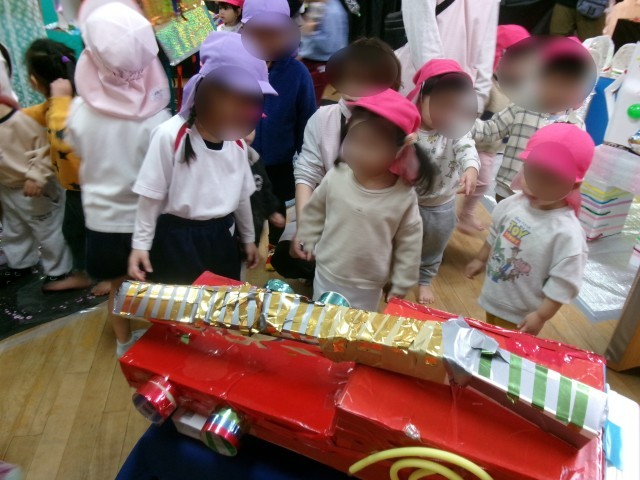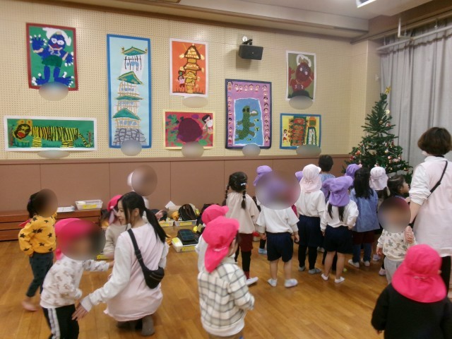 公園で遊んでいた、にじいろ保育園の子どもたちが、幼稚園の作品展に興味をもってくださり、参観してくださることになりました。