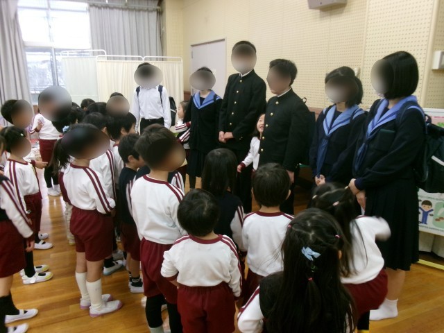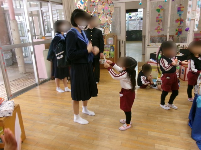 優しいお兄さん、お姉さんとの関わりは、園児にとっては、とても貴重です。先生でもなく、小学生より大きい存在の中学生は、素朴で真っすぐで、感覚的に“全てを受け入れてくれる・・・。”