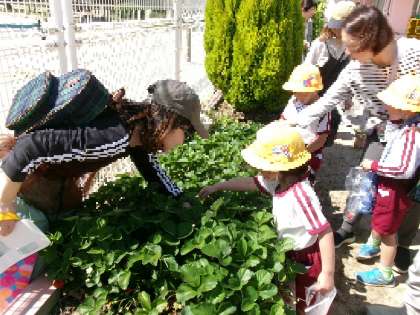 お家の人とイチゴ狩り (5歳児) 公開日 2024/05/14 更新日 2024/05/14 園児の様子 今年、イチゴの実りがよく、降園時に5歳児がお家の人とイチゴ狩りをしました。 葉もしっかり立っていて、見つけやすく、美味しそうなイチゴを3個次々と見つけて袋に入れていました。 イチゴの甘い香りが漂っていて、自然と顔がほころび、早く食べたい気持ちに・・ 後日、4歳児もイチゴ狩りができそう! いいね(0)