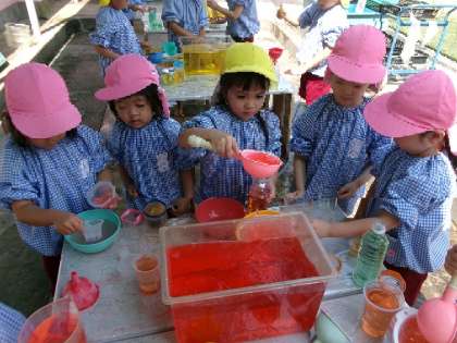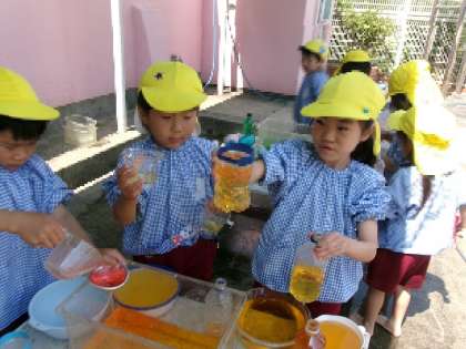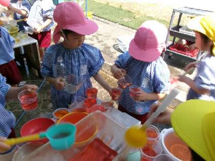 食紅でつくった赤、黄、緑の色水を思い思いで遊んでいました。