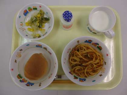 小型コッペパン ミートソーススパゲッティ レタスとコーンのサラダ