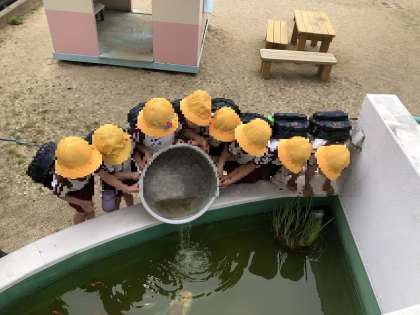 ⇒それを聞いたみんなは今日、ヤゴを金魚がいる池に放しました。