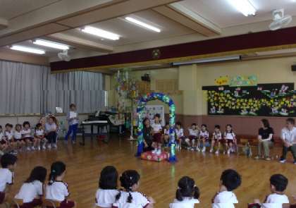 自己紹介の後、5歳児が紙コップでつくったロケットが誕生プレゼント。
