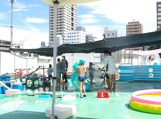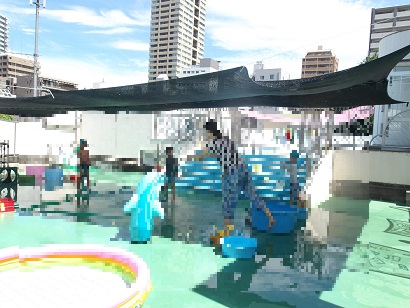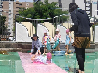 子どもたちは容赦なく保護者と水のかけあいっこ。