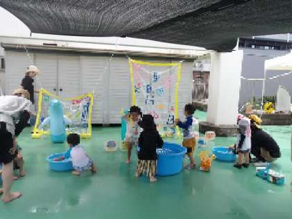 一学期最後のすくすくくらぶは2階テラスのウォーターパークで行いました。