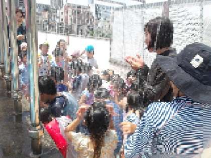 5歳児に見守られながら、大雨のシャワーにかかっていました