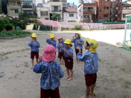 小さな穴がついている棒をシャボン液につけて吹くので、少しコツが必要でしたが、みんなかわいい 小さな シャボン玉を、沢山空に飛ばしていました。、