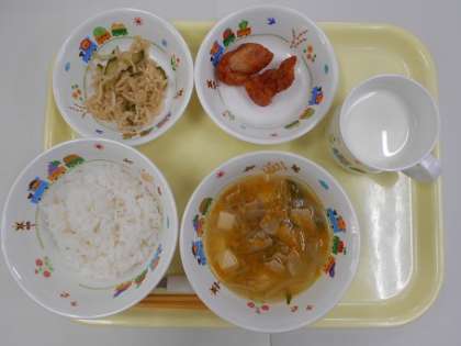 鶏肉のケチャップソース、豆腐のスープ、切り干し大根のナムル