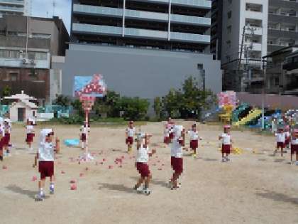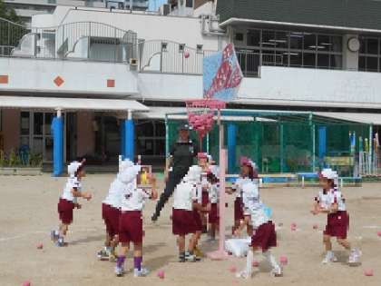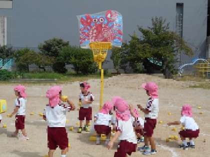 今、4歳児が遊んでいる玉入れは、ザリガニとカニにどれだけ餌をあげられるのか・・