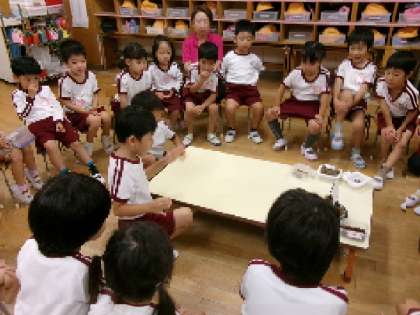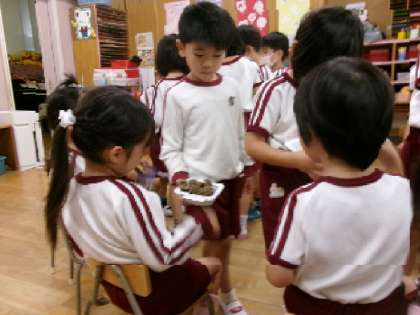 来年、幼稚園の畑に蒔いてもらおうと、4歳児の保育室に持っていっていました。
