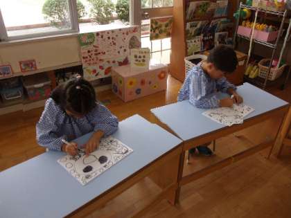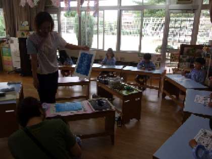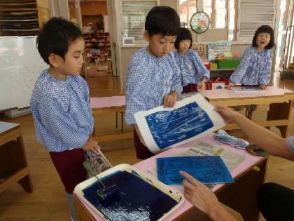 スチレン版に絵をかいて・・ (5歳児) 公開日 2024/10/28 更新日 2024/10/28 園児の様子 スチレン版に油性ペンを使って絵をかき、そこにインクをのせてバレンでギュッギュッとこすっていくと・・ わぁ 紙に絵がうつってる! みんなの瞳が輝いていました。 いいね(0)