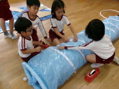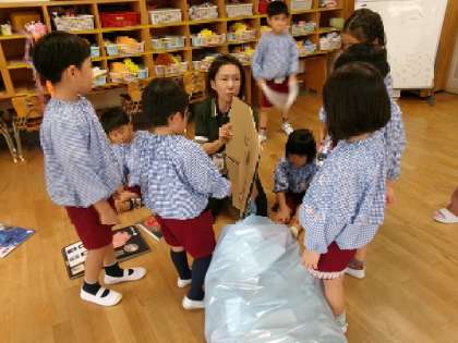 ジンベイザメの 体つくり (5歳児) 公開日 2024/10/29 更新日 2024/10/29 園児の様子 体のふくらみは紙をつめて・・ 口は? 大きく開けよう 何がいいかな・・ 素材を置いている場所に行って探し出しました 尾びれは? 段ボールにしよう 模様は何にする? ガチャガチャの入れ物を使ったら・・ 運動会を経て、みんなで考えを出し合って決めていけるようになってきています 出来上がりが楽しみですね いいね(0)