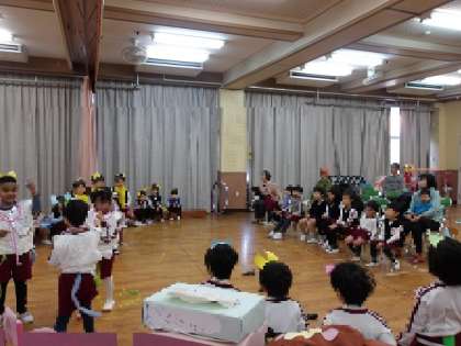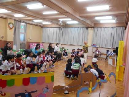 今日の未就園児園庭開放は寒さのため、プレイルームで生活発表会で披露した、劇遊びと楽器あそびを見ていただきました。
