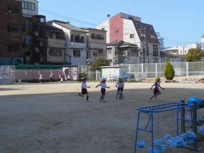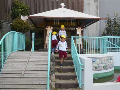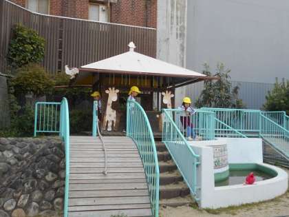 高低差のある園庭の隅にある、なんと素敵なままごと小屋♡…。