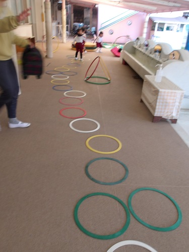 今日は、園庭がぬかるんでいたので、テラスの遊びを展開しています。