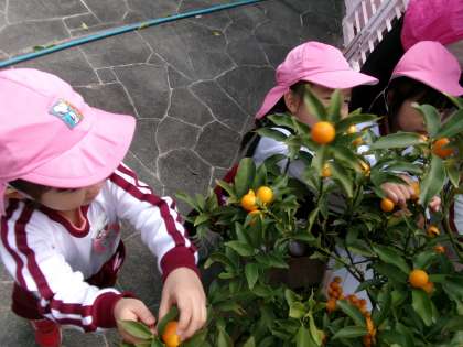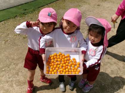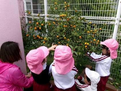 キンカンの木からいい香りがしているのに気付き「先生、これなあに?」と興味津々の子どもたち、皆で収穫してみました。