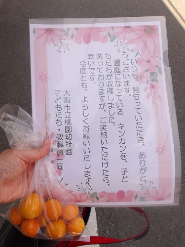 地域にキンカンのお届け 公開日 2025/04/17 更新日 2025/04/17 園児のようす 地域にキンカンをお届けに4人の5歳児と行ってきました。 お届けしているときの写真を撮り忘れてしまいました…。 (すみません…。。。) キンカンとお手紙を元気にお届けした子どもたちでした! いいね(0)