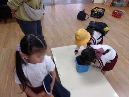 また、昨日捕まえたダンゴムシがどうなっているのか気になる子どもたちは、朝の支度をする前に、ダンゴムシをのぞき込みます。