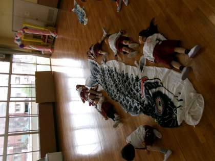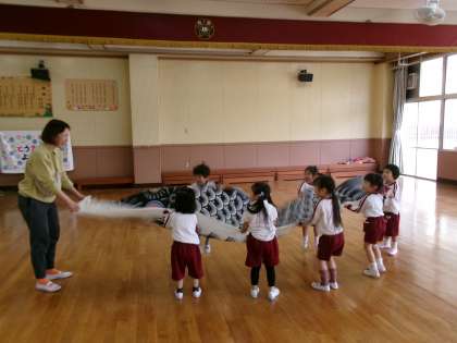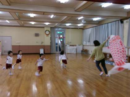 今日は、朝から雨だったので、外ではなく幼稚園のプレイルームでこいのぼりと遊びました。