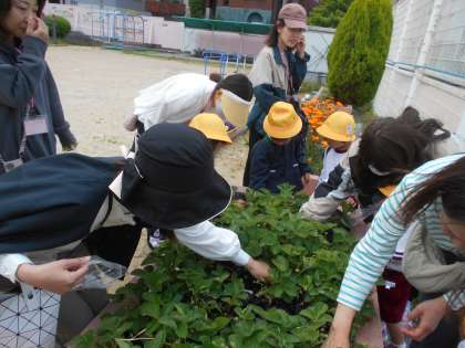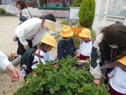 連休が明けて、幼稚園に来てみると真っ赤なイチゴが沢山できていました。