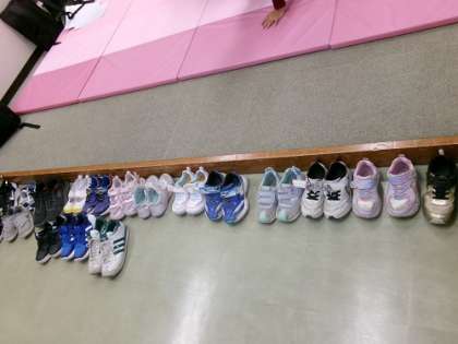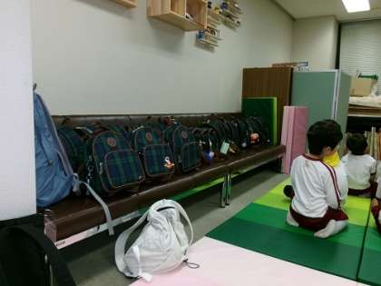 読み聞かせの部屋に入ると、なんと、上手に靴を並べて、椅子にリュックをおいて座っていました。