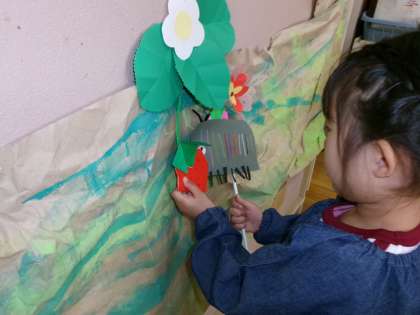 「お花の道を通っていこう」と友達とペープサートをうごかして楽しそう!!