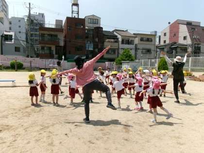 元気に体を動かすことを楽しむのは、子どもたちだけでなく、先生たちもとても楽しそうです。