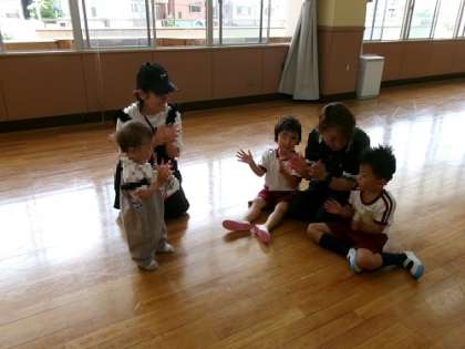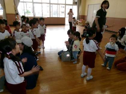 お茶を飲んでから、遊戯室に移動して、在園の子どもたちと一緒に楽しく体操をしました!