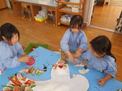 着物の端切れを職人さんのように丸や三角、四角など、いろいろな形に切っている子どもたち。着物の端切れなので、裏側にある織物の糸が大量に出てくるのですが、それも器用に裁いてくれていました。それをみんなで、ペタペタ貼っていきました。さあ、何になるのかはまたお知らせします。お楽しみに〜☆