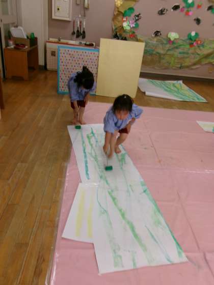 ローラーで繰り返し遊んだこともあり、線がつく面白さや色の重なりの美しさに気付きながら、楽しみました。