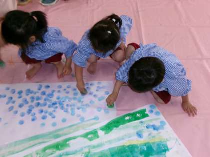 空を作ろうと、今度はスポンジを使ってポンポンとスタンプ遊び、