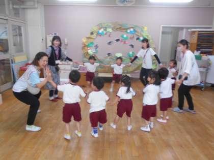 おうちの方が先生となって保育室では、「サクランボのマンボ」の仲良し遊びをしたり、歌を歌ったりしました。