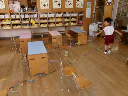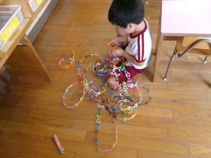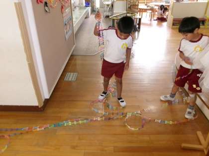 「どれだけ長くなったんか、のばしてみよう!」部屋の端で持つ子と、反対側の端をもって廊下まで出ていく子。長すぎて、顔が見えず、声も聞こえなくなっていくので、のばして長さを確認するのはなかなか難しい(笑)それでも一生懸命広げて「なっがー」「ここどうなってるん?」となんだか嬉しそう。友達と同じ目的をもって、自分たちで協力しながら、遊ぶ姿も見られるようになってきました。これからの成長も楽しみです!