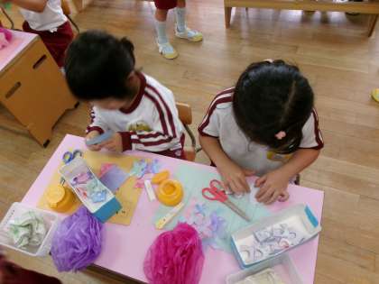 「先生できた〜」「見て見て!こんな形になった」成功したお花を持って、とても嬉しそうな顔。自信をもって、繰り返し作ることを楽しんでいました。