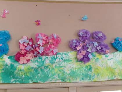 完成したアジサイの花は、すぐにお部屋の壁面に!作ったものをすぐに飾ってもらえることで嬉しさが増しますね。次は、何を作ろうかな〜楽しみです。