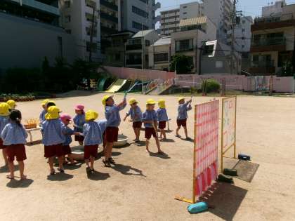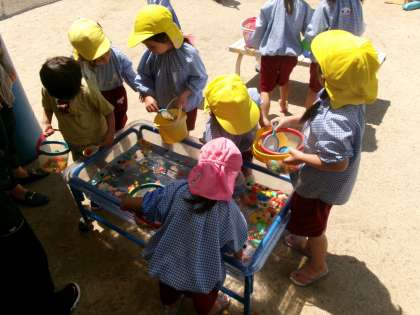 水が気持ちいい季節になってきました。良いお天気の中、水鉄砲やスーパーボールすくいで遊び、大喜びの子どもたちです。