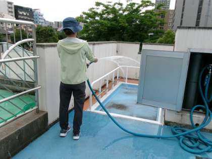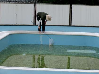 プールの中にヤゴを見つけて、虫好きの子どもたちのために、採取しています。
