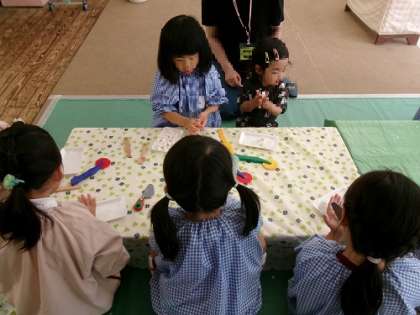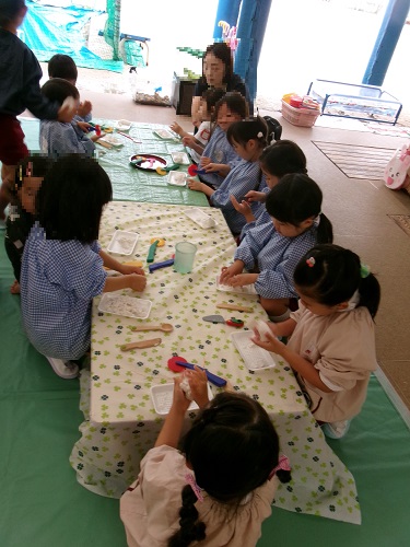 幼稚園での小麦粉粘土や、スーパーボールすくい、ままごとなど在園児と関わって遊んでいただきました。
