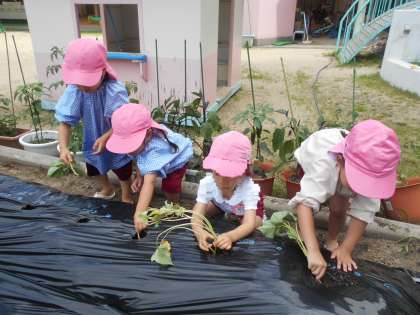 先日までジャガイモが育っていた畑に、次はサツマイモの苗を植えました。