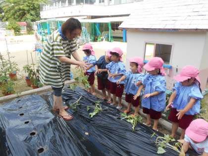 先生の話をよく聞いて、苗を土の中にそーっと入れて、上から土をかけました。