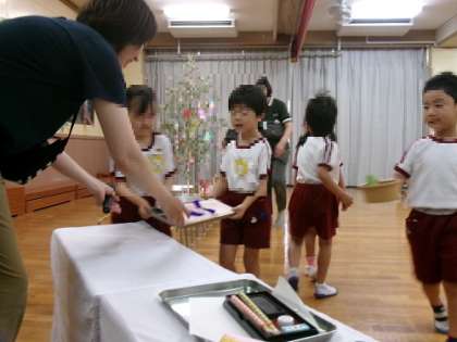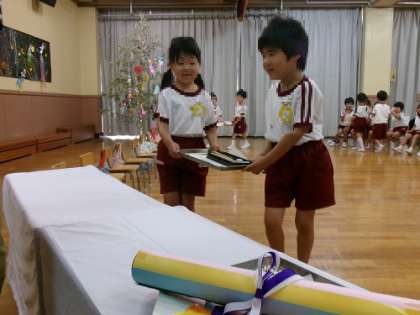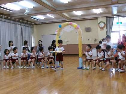 今日は誕生会と七夕の集いでした。 誕生のお友達がお供えをもって、入場してきてくれました!