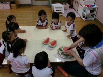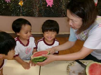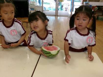 すいかの収穫(4歳児) 公開日 2025/07/17 更新日 2025/07/17 園児のようす スイカが大きく実りました! 今日、スイカを4歳児の前で切り分けました! スイカがこんなに大きく実り、生長するなんて! 大きくなることが、とても難しいスイカの収穫に驚きです! 子どもたちの笑顔! 1切れずつ持って帰りました! いいね(0)
