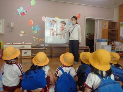 幼稚園のトイレを安心して利用できるよう、人形のみおちゃんと一緒にトイレの使い方について、養護教諭から話を聞きました。上靴からスリッパに履き替えることや衣服の始末、トイレットペーパーの切り方など視覚的に分かりやすく話していったので、興味をもって最後まで聞いていました。指導の後に、「今度、トイレに行ったら出来るよ!」の言葉が(^^)