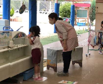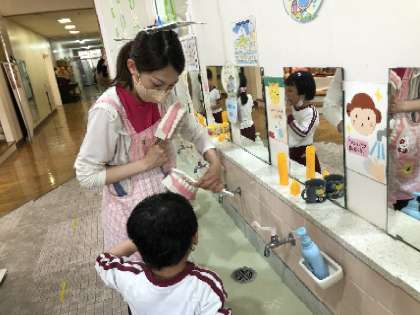 昼食の後は・・ 公開日 2022/04/26 更新日 2022/05/23 保健室からのお知らせ 昼食後、4歳児は、しばらくの間はぶくぶくうがいをします。今日から昼食が始まったばかりなので、無理をせずに進めていきます。一方、5歳児は、歯みがきをしています。友達との距離をとり、みがき残しをしないよう鏡を見たり、養護教諭の仕草を見たりして取り組んでいます。6歳臼歯が生えてくる時期でもあるので、ご家庭でも仕上げみがきよろしくお願いします。 いいね(0)