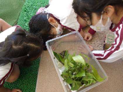 わぁ!ちょうが! (5歳児) 公開日 2022/05/02 更新日 2022/05/02 園児の様子 テラスで飼育ケースの蓋を開けていると、ちょうがレモンの葉にとまりました。「何をしているのかな・・」ちょうの様子をじっと見ていると・・なんということでしょう!卵を産み付けているではありませんか!神秘的な瞬間に遭遇できてWonderful! いいね(0)