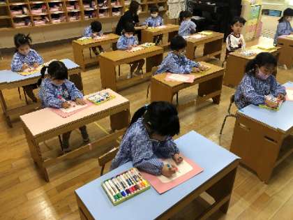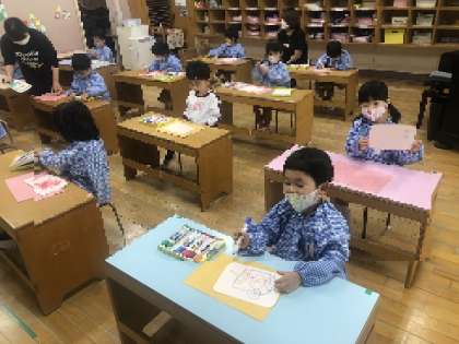 今日はペンを使っておえかき。「なんの野菜を育てるのかな」「美味しい野菜ができるといいね」先生との会話で子どもたちは、思いをもち、紙面にペンを走らせていきました。先生は、一人ひとりがかいている様子から思いを汲み取りながら、言葉をかけていきます。今日の絵は夏野菜の名札にして飾ります(^^)
