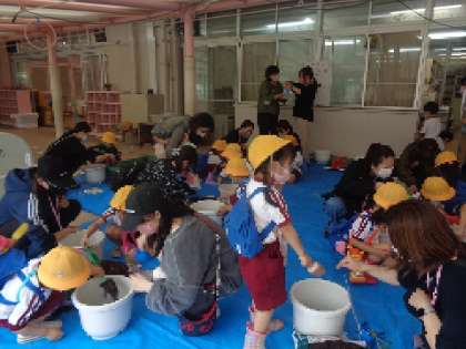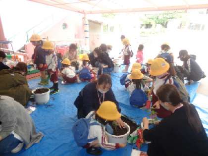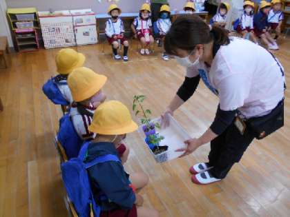 12日、あいにくの天候でしたが、4歳児がテラスを利用して、夏野菜の苗植えをしました。苗植え前に、ミニトマト、オクラなどの苗をみんなで見ました。葉の違いに気付いた子どももいました。これからどのように生長していくのでしょうね(^^)育てながら見ていきましょうね