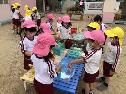 黄、水、緑のきれいな色の水が水槽に用意されました。思わず手にとってみたくなりますよね。約束は一つ。元に戻す時は、同じ色の水槽に入れること。思い思いに容器を直接水槽に入れたり、柄杓を使ったりして、遊んでいました。あっという間に横のテーブルは色水が入った容器が並べられました。子どもたちの様子を見ていた教師は次にペットボトルを準備。ペットボトルに水を入れるには口が狭い。どうすれば入るのかな。実はペットボトルと同時にじょうごも用意していたのです。ただおもむろに入れるのでなく、自分なりに調整しなくてはならなくなりました。それでも、なんとかして容器に入れたい思いを実現するために、自分なりに考えて入れていました。今日は「容器に入れる」ことが目的の子どもたちが多かったのですが、これから、いろいろな遊びに発展することでしょう。とても楽しみです。
